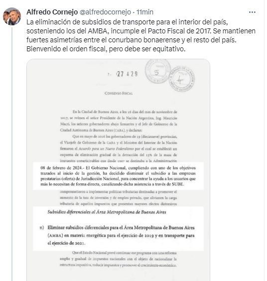 "La eliminación de subsidios de transporte para el interior del país, sosteniendo los del AMBA, incumple el Pacto Fiscal de 2017. Se mantienen fuertes asimetrías entre el conurbano bonaerense y el resto del país. Bienvenido el orden fiscal, pero debe ser equitativo", afirmó en las redes sociales el gobernador de Mendoza.