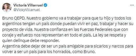 Al igual que Milei, Villarruel envió sus condolencias a los familiares de la víctima y prometió que el Gobierno trabajará para que el hijo del joven asesinado, así como el resto de los argentinos, "tengan un país donde puedan vivir en paz, trabajar y hacer su proyecto de vida".