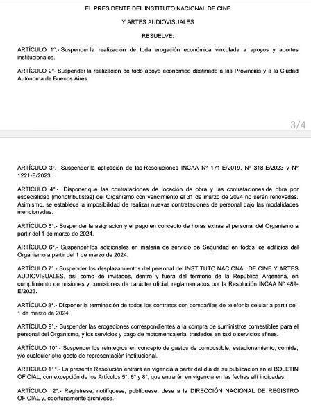 Este lunes se conoció una nueva resolución del Gobierno que apunta con varios recortes hacia el Instituto Nacional de Cine y Artes Audiovisuales (INCAA).