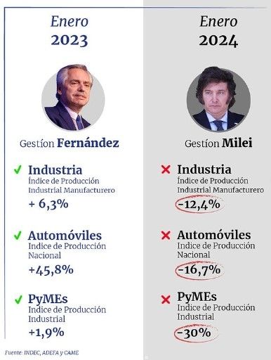 "La inflación durante el periodo diciembre-febrero ha alcanzado casi el 60%. Sumado a esto, la alarmante caída del 12,4% en el Índice de Producción Industrial Manufacturero (IPIM) de Argentina en enero de 2024, nos obliga a dirigir la atención ciudadana hacia esta situación", expresó.