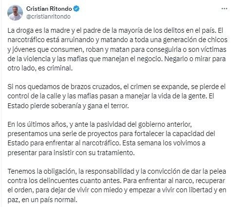 Ritondo compartió la batería de iniciativas en su red social X, donde alertó que "la droga es la madre y el padre de la mayoría de los delitos en el país".