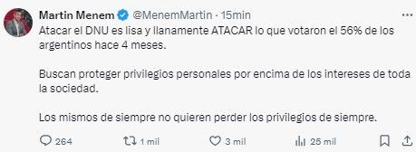 Uno de los primeros en reaccionar fue el titular de la Cámara de la Cámara Baja, Martín Menem, quien denunció que "atacaron" lo que votó el 56% de los argentinos.