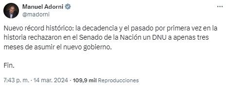 El vocero presidencial, Manuel Adorni, también cuestionó la negativa al mega decreto y señaló que se trató de un "nuevo récord histórico". "La decadencia y el pasado por primera vez en la historia rechazaron en el Senado de la Nación un DNU a apenas tres meses de asumir el nuevo gobierno. Fin", afirmó.