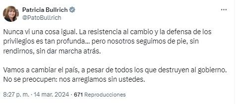"Nunca vi una cosa igual. La resistencia al cambio y la defensa de los privilegios es tan profunda. Pero nosotros seguimos de pie, sin rendirnos, sin dar marcha atrás. Vamos a cambiar el país, a pesar de todos los que destruyen al gobierno. No se preocupen: nos arreglamos sin ustedes", sostuvo la funcionaria.