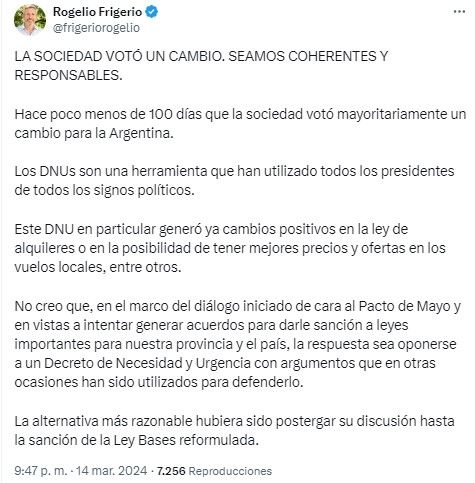 "No creo que, en el marco del diálogo iniciado de cara al Pacto de Mayo y en vistas a intentar generar acuerdos para darle sanción a leyes importantes para nuestra provincia y el país, la respuesta sea oponerse a un Decreto de Necesidad y Urgencia con argumentos que en otras ocasiones han sido utilizados para defenderlo", resaltó.