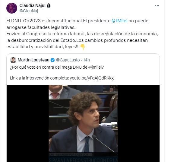 "El DNU 70/2023 es inconstitucional.El presidente Javier Milei no puede arrogarse facultades legislativas. Envíen al Congreso la reforma laboral, las desregulación de la economía, la desburocratización del Estado.Los cambios profundos necesitan estabilidad y previsibilidad, leyes!!!", había escrito Najul compartiendo un video en el que Martín Lousteau justifica su rechazo al DNU.