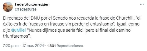 Finalmente, el economista dejó una conclusión de cara al debate en la Cámara Baja: "El rechazo del DNU por el Senado nos recuerda la frase de Churchill, ´el éxito es ir de fracaso en fracaso sin perder el entusiasmo´. Igual, como dijo Milei: 'Nunca dijimos que sería fácil pero al final del camino triunfaremos´".