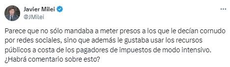 Milei aprovechó para despacharse contra el exjefe jujeño y excandidato a vicepresidente: "Parece que no sólo mandaba a meter presos a los que le decían cornudo por redes sociales, sino que además le gustaba usar los recursos públicos a costa de los pagadores de impuestos de modo intensivo. ¿Habrá comentario sobre esto?".