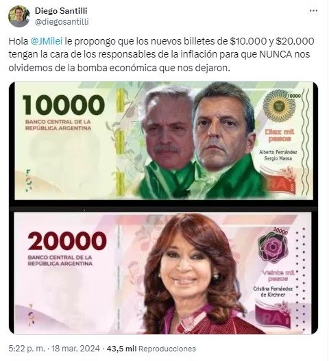 "Hola Javier Milei. Le propongo que los nuevos billetes de $10.000 y $20.000 tengan la cara de los responsables de la inflación para que nunca nos olvidemos de la bomba económica que nos dejaron", disparó el diputado en la red social X.