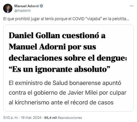 El vocero presidencial, Manuel Adorni, cruzó en redes sociales al exministro de Salud y diputado nacional, Daniel Gollán, por tildarlo de "ignorante absoluto" por sus comentarios sobre la crisis del dengue.