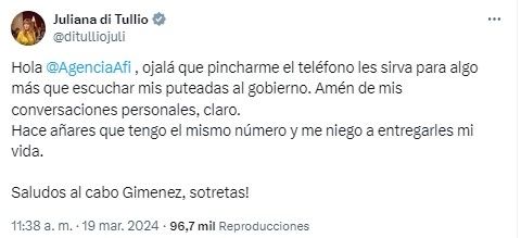 "Hola Agencia AFI, ojalá que pincharme el teléfono les sirva para algo más que escuchar mis puteadas al gobierno. Amén de mis conversaciones personales, claro", escribió en la red social X.