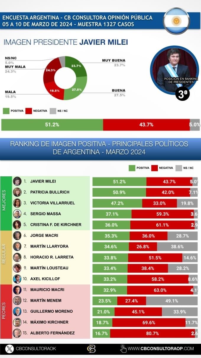 Allí, Milei quedó en tercer puesto con más del 51% de imagen positiva, quedando solo detrás de su par de Ecuador, Daniel Noboa (62.5%), y el uruguayo Luis Lacalle Pou, con 54.2 por ciento.