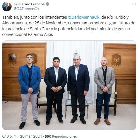 "Productivo encuentro con el gobernador de Santa Cruz, Claudio Vidal. Analizamos la situación de Yacimientos Carboníferos Río Turbio y avanzamos en un esquema de trabajo que potencia la inversión extranjera y las posibilidades de exportación del carbón", sostuvo Francos en la red social X.
