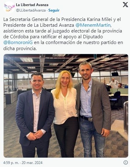 Para el discurso inaugural que dio el presidente ante la Asamblea Legislativa, escribió: “Muy buen discurso de Milei. Claro en su mensaje y en el rumbo de hacia donde tiene que ir nuestro país”.