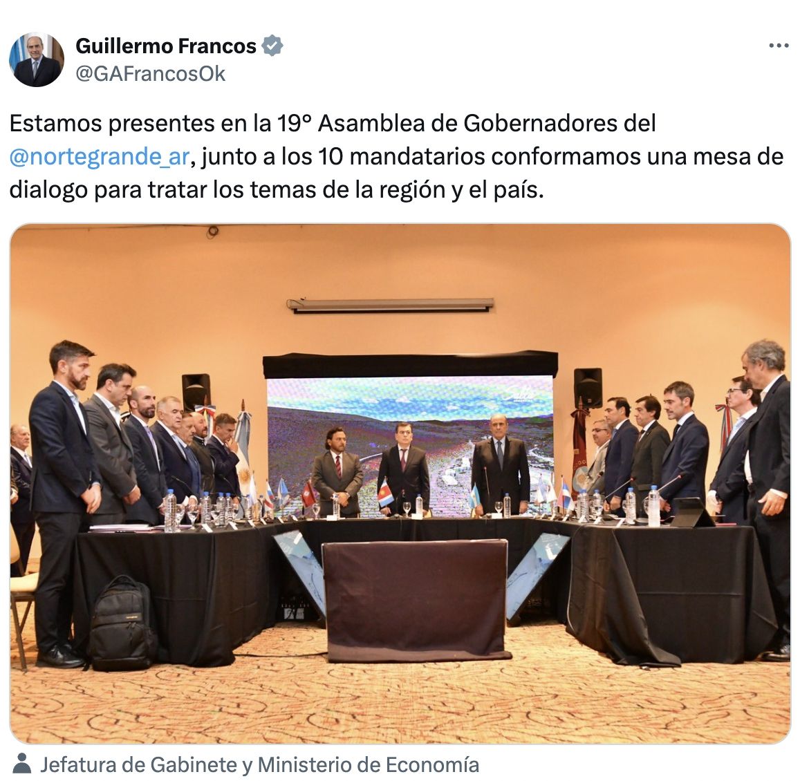 Los gobernadores que hoy se vieron la cara con Francos fueron Gustavo Sáenz, Gerardo Zamora (Santiago del Estero), Gildo Insfrán (Formosa), Hugo Passalacqua (Misiones), Carlos Sadir (Jujuy), Osvaldo Jaldo (Tucumán), Gustavo Valdés (Corrientes), Leandro Zdero (Chaco), Raúl Jalil (Catamarca), y Ricardo Quintela (La Rioja). Por su parte, el ministro fue acompañado por José Rolandi, vicejefe de Gabinete de la Nación, Carlos Guberman, secretario de Hacienda, Lisandro Catalán, secretario del Interior, Javier Milano Rodríguez, secretario de Provincias y Municipios, Bartolomé Heredia, interventor del Ente Nacional De Obras Hídricas De Saneamiento (Enohsa).