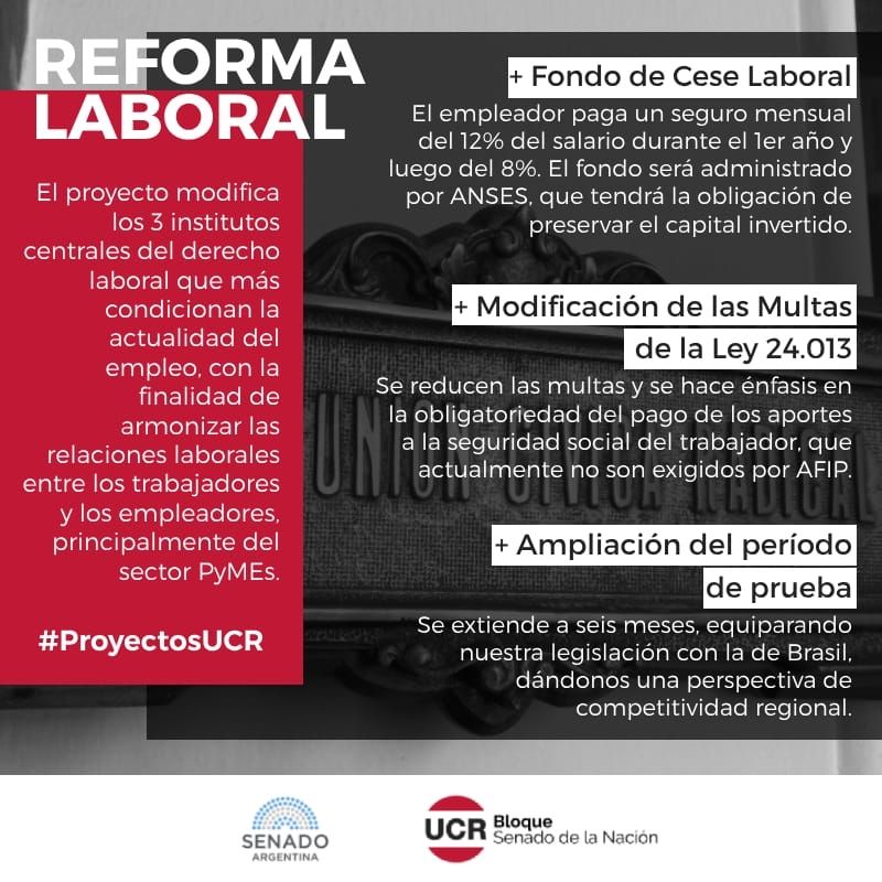 En el proyecto se crea un Fondo de Cese Laboral “para aliviar las cargas que afrontan las PyMes frente a la litigiosidad y la conflictividad laboral”, también se avanza en la reforma a la Ley 24.013 que fija multas “reduciéndolas y haciendo énfasis en la obligatoriedad del pago de los aportes a la seguridad social del trabajador, que actualmente no son exigidas por AFIP”. También se amplía a seis meses el período de prueba antes de efectivizar una relación laboral, poniendo en línea la legislación argentina equiparando nuestra legislación con la de Brasil.