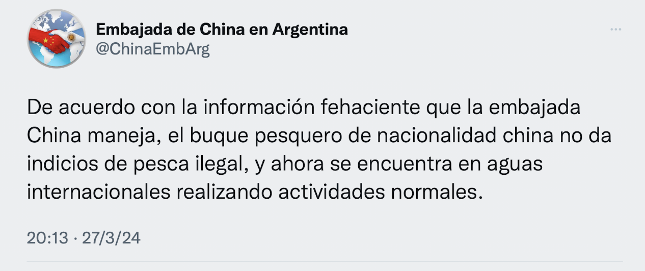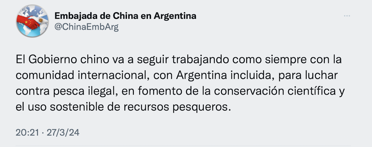 Más tarde, la embajada clausuró la escalada mediática con un nuevo posteo en X: "El Gobierno chino va a seguir trabajando como siempre con la comunidad internacional, con Argentina incluida, para luchar contra pesca ilegal, en fomento de la conservación científica y el uso sostenible de recursos pesqueros".