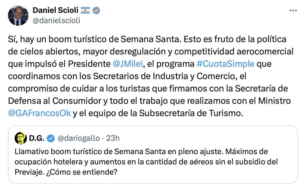 El secretario de Turismo, Ambiente y Deportes de la Nación, Daniel Scioli, explicó a través de redes sociales que el "boom turístico" de Semana Santa en pleno ajuste se debe a la "política de cielos abiertos, mayor desregulación y competitividad aerocomercial que impulsó el presidente Javier Milei".