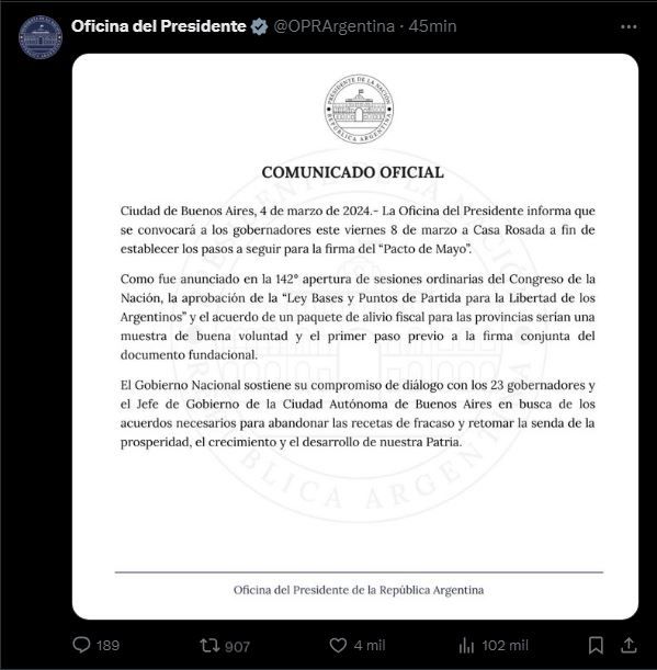 El Gobierno nacional dispuso que convocará para el próximo viernes a todos los gobernadores a la Casa Rosada para avanzar con la firma de un preacuerdo de políticas de Estado y discutir el paquete de reformas que se enviará al Congreso y un posible pacto fiscal.