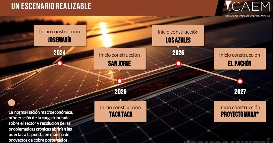 Mendoza busca ser parte de la “mesa del cobre”, que agrupa a las provincias que tienen potencial. De hecho, entre los proyectos priorizados por ese grupo figura San Jorge, la mina que se proyectaba explotar en Uspallata, pero fue vedada por la Legislatura. Hay 6 proyectos mineros que estarían en condiciones de ser explotados en los próximos años. La mayoría de ellos está en San Juan: Josemaría, Los Azules, y Pachón. Uno está en Catamarca (MARA), otro en Salta (Taca Taca) y uno en Mendoza (San Jorge) que es el más chico. "Luego del período de obras y maduración de las inversiones necesarias, hacia 2027 se registrarían las primeras exportaciones de cobre, que se multiplicarían cuatro veces conforme avancen el resto de las inversiones. Hacia 2035 alcanzarían USD 8.341 millones, lo que para el país significaría un incremento de más del 10% de su nivel de exportaciones de 2022", se ilusionan desde la Mesa del Cobre. Claro, antes esperan señales políticas y mejoras en la macroeconomía para motivar las inversiones.