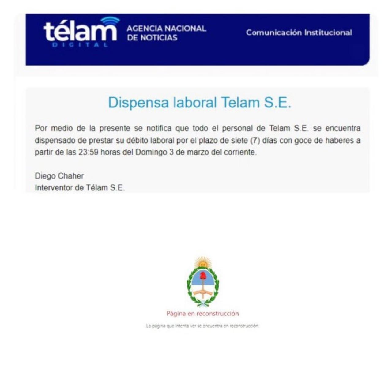 El vallado se produjo durante las primeras horas de la madrugada, incluso con los trabajadores adentro. A todos los empleados les llegó un mail de dispensa laboral, con el siguiente mensaje: "Por medio de la presente, se notifica que todo el personal de Télam S.E. se encuentra dispensado de prestar su débito laboral por el plazo de siete (7) días con goce de haberes a partir de las 23.59 horas del domingo 3 de marzo del corriente".