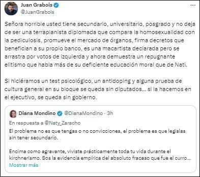 “Señora horrible usted tiene secundario, universitario, posgrado y no deja de ser una terraplanista diplomada que compara la homosexualidad con la pediculosis, promueve el mercado de órganos, firma decretos que benefician a su propio banco, es una macartista declarada pero se arrastra por votos de izquierda y ahora demuestra un repugnante elitismo que habla más de su deficiente educación moral que de Nati”, disparó.
