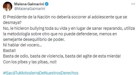 Galmarini no tardó en salirle al cruce y también aprovechó para cuestionar la reacción de Milei. "¿El presidente de la Nación no debería socorrer al adolescente que se desmaya? No, le hicieron bullying toda su vida y en lugar de sanar reparando, utiliza la metodología sobre otro que no puede defenderse, menos en semejante desequilibrio de poder", apuntó la extitular de AySA.