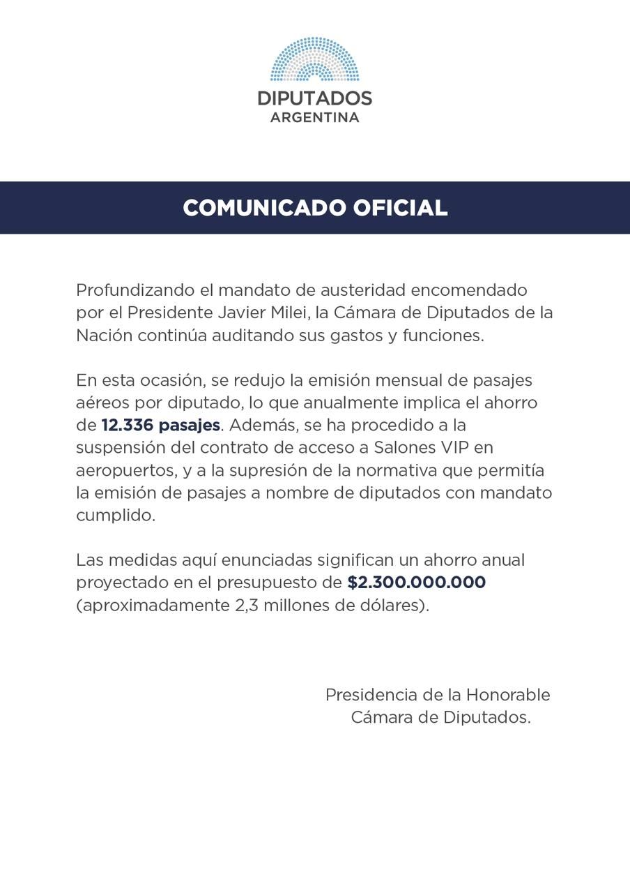 "Además, se ha procedido a la suspensión del contrato de acceso a salones VIP en aeropuertos, y a la supresión de la normativa que permitía la emisión de pasajes a nombre de diputados con mandato cumplido", indicó el texto.