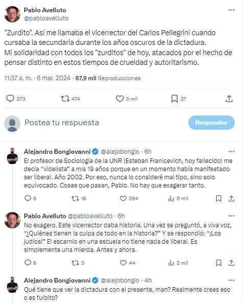 "No exagero. Este vicerrector daba historia. Una vez se preguntó, a viva voz, '¿Quiénes tienen la culpa de todo en la historia?'. Y se respondió: '¡Los judíos!' El escarnio en una escuela no tiene nada de liberal. Es simplemente una mierda. Antes y ahora", le retrucó Avelluto.