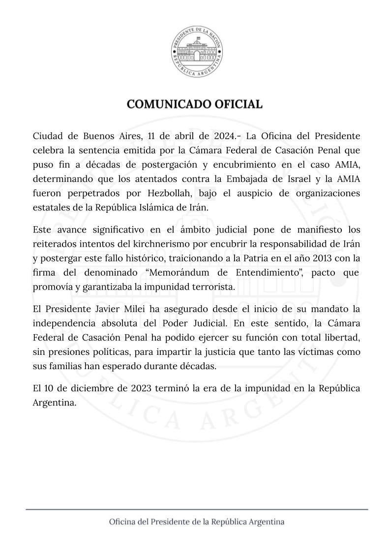 "La Oficina del Presidente celebra la sentencia emitida por la Cámara Federal de Casación Penal que puso fin a décadas de postergación y encubrimiento en el caso AMIA, determinando que los atentados contra la Embajada de Israel y la AMIA fueron perpetrados por Hezbollah, bajo el auspicio de organizaciones estatales de la República Islámica de Irán", comienza el comunicado.