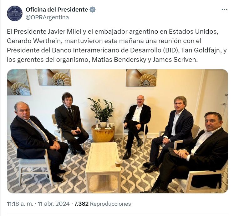 El mandatario Javier Milei y el embajador argentino en Estados Unidos, Gerardo Werthein, se reunieron hoy con el presidente del Banco Interamericano de Desarrollo (BID), Ilan Goldfajn, y los gerentes del organismo, Matias Bendersky y James Scriven.