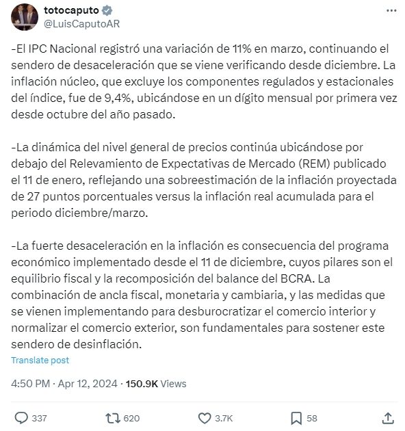 El ministro de Economía, Luis Caputo, analizó el 11% de inflación de marzo que dio a conocer este viernes el Indec y valoró el "sendero de desaceleración que se viene verificando desde diciembre".