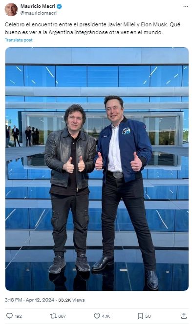 "Celebro el encuentro entre el presidente Javier Milei y Elon Musk. Qué bueno es ver a la Argentina integrándose otra vez en el mundo", escribió Mauricio Macri en su cuenta de X, publicación acompañada por la foto que circuló del encuentro entre el presidente y el magnate en las fábricas de Tesla.