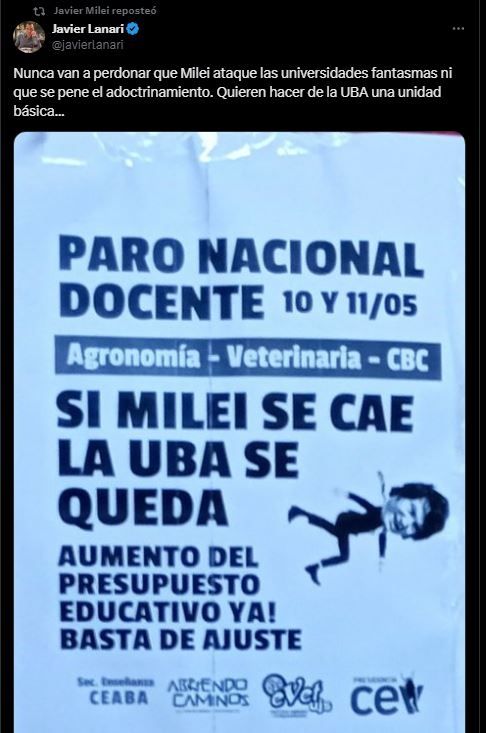 El presidente Javier Milei volvió a cargar contra la Universidad Nacional de Buenos Aires (UBA) al denunciar adoctrinamiento y persecución contra los estudiantes libertarios. Lo hizo a través de sus redes sociales, en medio de los cuestionamientos a Irán tras su ataque a Israel y donde compartió un flyer del centro de estudiantes de Ciencias Económicas que convocaba a una acción contra las políticas de ajuste del Gobierno.
