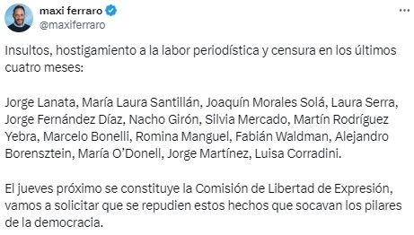 En ese sentido, el presidente de la Coalición Cívica, Maximiliano Ferraro, compartió un posteo donde enumeró los periodistas con los cuáles Milei tuvo cruces.