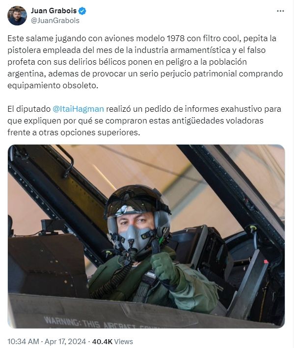 "Este salame jugando con aviones modelo 1978 con filtro cool", dijo en sus redes Juan Grabois desde donde también apuntó contra Patricia Bullrich, a quien tildó de "pepita la pistolera" ya que la consideró como "empleada del mes de la industria armamentística".