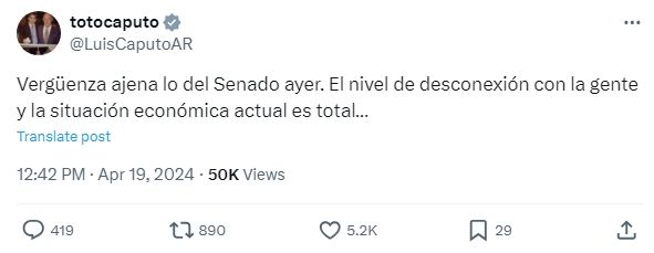 "Vergüenza ajena lo del Senado ayer. El nivel de desconexión con la gente y la situación económica actual es total", dijo en su cuenta de X.