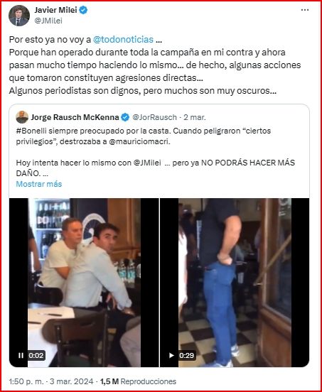 "Por eso ya no voy a Todo Noticias. Porque han operado durante toda la campaña en mi contra y ahora pasan mucho tiempo haciendo lo mismo... de hecho, algunas acciones que tomaron constituyen agresiones directas... Algunos periodistas son dignos, pero muchos son muy oscuros...", indicó Milei en su posteo.