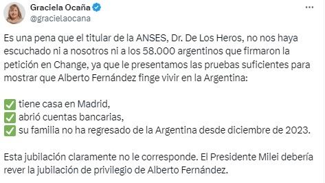 "Es una pena que el titular de la ANSES, Dr. De Los Heros, no nos haya escuchado ni a nosotros ni a los 58.000 argentinos que firmaron la petición en Change, ya que le presentamos las pruebas suficientes para mostrar que Alberto Fernández finge vivir en la Argentina: tiene casa en Madrid, abrió cuentas bancarias, su familia no ha regresado de la Argentina desde diciembre de 2023", dijo.