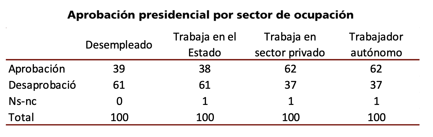 Un punto del informe se viralizó en redes porque muestra un dato relevante de división social en los apoyos a Milei. Si se toma la ocupación, las diferencias son más fuertes que en género, edad o lugar de residencia. Entre los trabajadores del Estado o los desempleados, la aprobación no llega al 40%. En cambio, entre trabajadores del sector privado o los autónomos, se dispara arriba del 60% (ver cuadro).