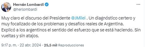 Otro de los que festejó el anuncio de Milei fue el diputado del PRO Hernán Lombardi, quien resaltó la claridad del discurso con "un diagnóstico certero y muy focalizado de los problemas y desafíos reales de Argentina". "Explicó a los argentinos el sentido del esfuerzo que se está haciendo. Sin vueltas y sin atajos”, expresó.