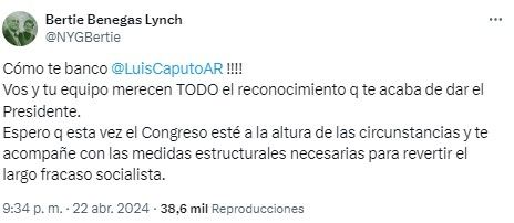 "¡Cómo te banco Caputo! Vos y tu equipo merecen todo el reconocimiento q te acaba de dar el Presidente. Espero que esta vez el Congreso esté a la altura de las circunstancias y te acompañe con las medidas estructurales necesarias para revertir el largo fracaso socialista", escribió en la red social X.