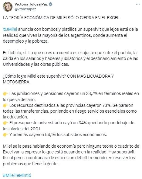 En la vereda opuesta, la diputada de Unión por la Patria Victoria Tolosa Paz realizó un duro descargo donde cuestionó la gestión económica y remarcó que el anuncio "con bombos y platillos" del superávit refleja que Milei está lejos "de la realidad que viven la mayoría de los argentinos, donde aumenta el desempleo y la pobreza”.