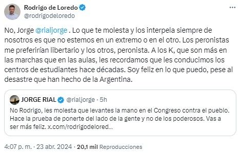 El posteo tuvo la respuesta del conductor de televisión, quien le recriminó su apoyo a la ley ómnibus en el Congreso. “No Rodrigo, les molesta que levantes la mano en el Congreso contra el pueblo. Hace la prueba de ponerte del lado de la gente y no de los poderosos. Vas a ser más feliz”, afirmó el periodista en la red social X.