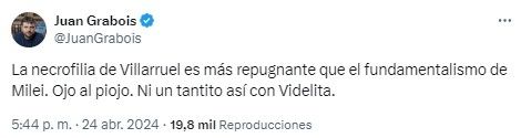 La publicación provocó la reacción de Grabois quien le respondió con un durísimo mensaje. "La necrofilia de Villarruel es más repugnante que el fundamentalismo de Milei. Ojo al piojo", disparó.