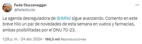 El expresidente del Banco Central posteó un hilo de mensajes para anunciar que "la agenda desreguladora de Javier Milei sigue avanzando" y pasó a referirse a "un par de novedades de esta semana en vuelos y farmacias, ambas posibilitadas por el DNU 70-23".