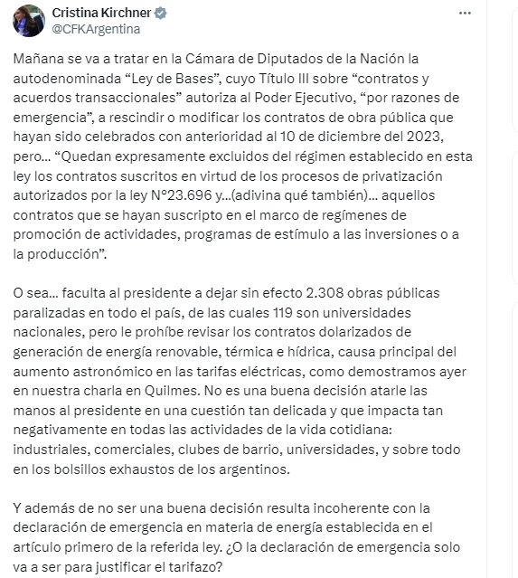 "Mañana se va a tratar en la Cámara de Diputados de la Nación la autodenominada 'Ley de Bases', cuyo Título III sobre 'contratos y acuerdos transaccionales' autoriza al Poder Ejecutivo, 'por razones de emergencia', a rescindir o modificar los contratos de obra pública que hayan sido celebrados con anterioridad al 10 de diciembre del 2023, pero… 'Quedan expresamente excluidos del régimen establecido en esta ley los contratos suscritos en virtud de los procesos de privatización autorizados por la ley N°23.696 y…(adivina qué también)… aquellos contratos que se hayan suscripto en el marco de regímenes de promoción de actividades, programas de estímulo a las inversiones o a la producción'", dijo Cristina Fernández de Kirchner.