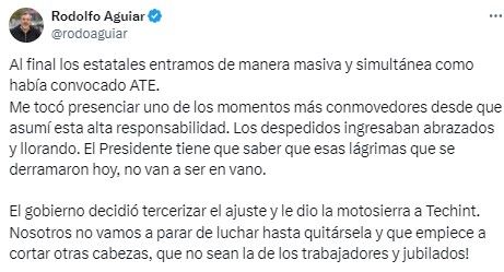 "Le vamos a dar pelea y le vamos a sacar la motosierra", advirtió el líder de ATE Nacional, Rodolfo Aguiar, y advirtió que "este fin de semana se recibieron miles y miles de telegramas de despidos, en todos los casos ilegales y arbitrarios". Según el gremialista, "son más de 11 mil despidos fehacientemente comunicados en todo el país".