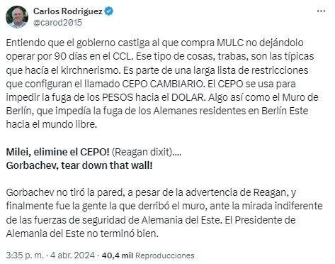 En un mensaje por la red social X, escribió: "Entiendo que el gobierno castiga al que compra MULC no dejándolo operar por 90 días en el CCL. Ese tipo de cosas, trabas, son las típicas que hacía el kirchnerismo".