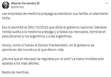 "Las empresas de medicina prepaga aumentaron sus tarifas un alarmante 153%. Eso lo permitió el DNU 70/2023 que dictó el gobierno nacional", escribió en la red social X.